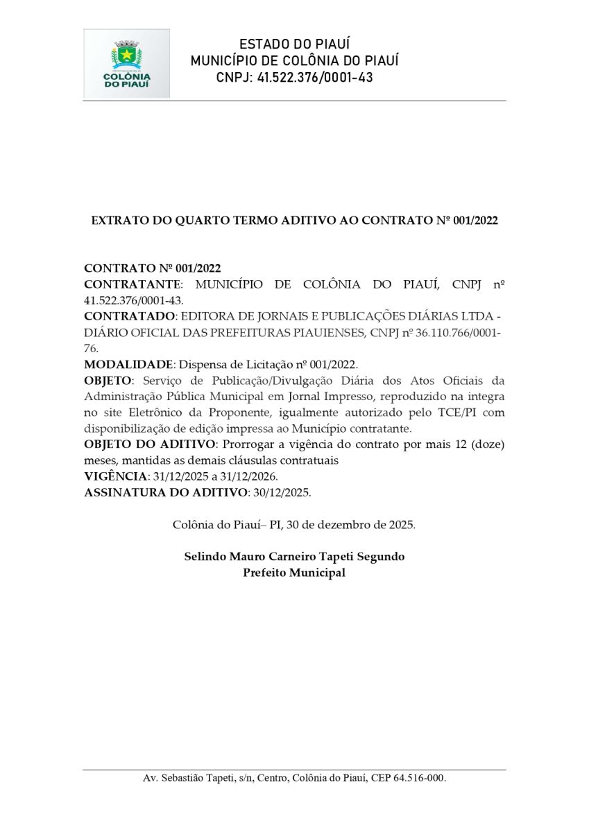 AVISO EXTRATO DO QUARTO TERMO ADITIVO AO CONTRATO Nº 001/2022