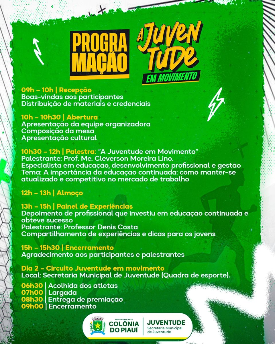A Secretaria Municipal de Juventude de Colônia do Piauí realizará, nos dias 28 e 29 de setembro, o projeto “A Juventude em Movimento”, em comemoração ao Dia Internacional da Juventude. A iniciativa reunirá palestras, oficinas e práticas esportivas, com foco na formação continuada, na adaptação às transformações do mercado de trabalho e no fortalecimento da autoestima dos participantes.