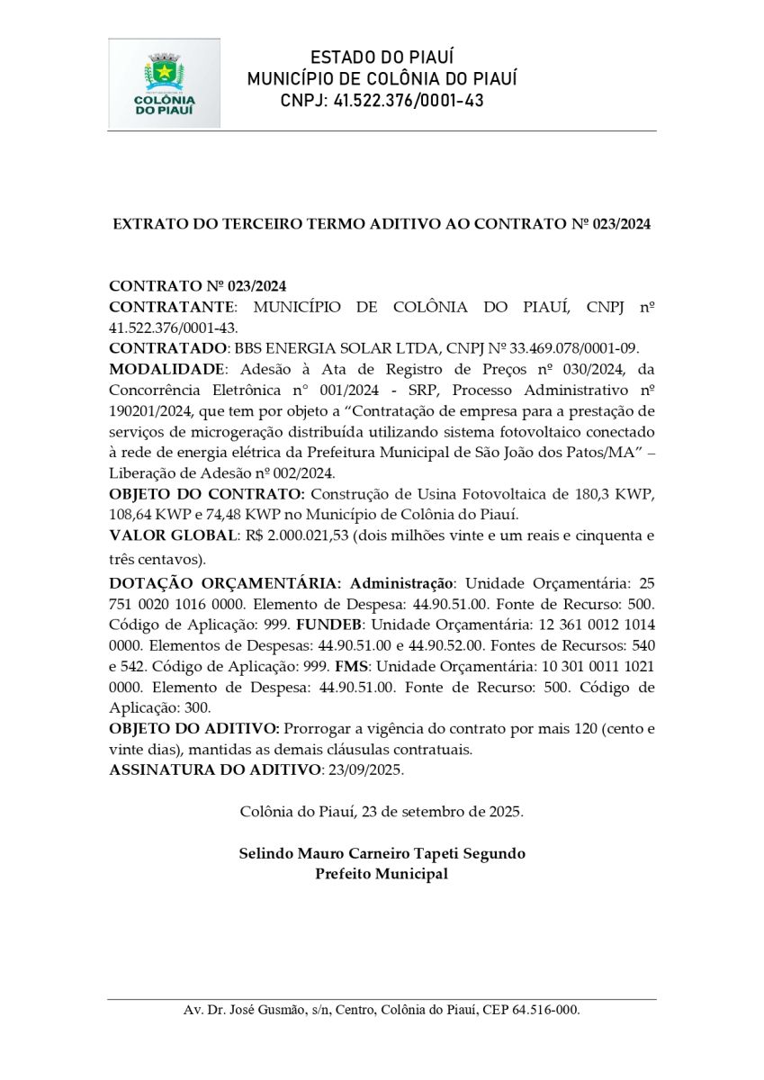 EXTRATO DO TERCEIRO TERMO ADITIVO AO CONTRATO Nº 023/2024