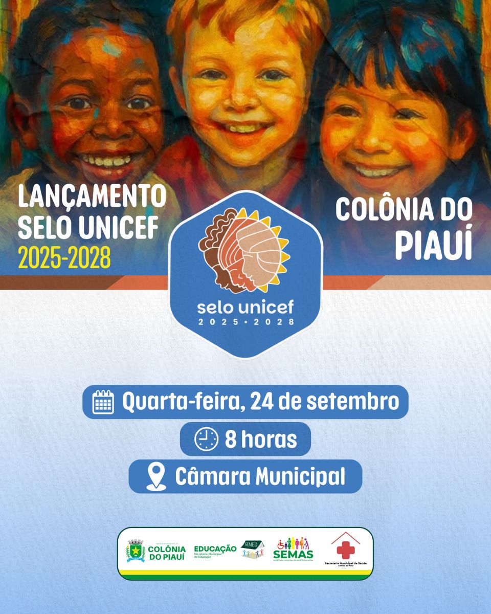 Nesta quarta-feira, 24 de setembro, Colônia do Piauí dará início à mobilização para o Selo UNICEF 2025-2028. O lançamento oficial acontecerá às 8h, na Câmara Municipal, reunindo representantes da gestão municipal, profissionais das áreas de educação, saúde, assistência social e membros da comunidade.