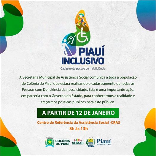 A Secretaria Municipal de Assistência Social comunica a toda a população de Colônia do Piauí que, a partir de 12 de janeiro, estará realizando o cadastramento de todas as Pessoas com Deficiência da nossa cidade.