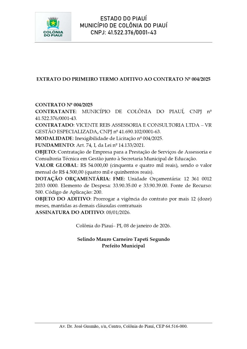 AVISO EXTRATO DO PRIMEIRO TERMO ADITIVO AO CONTRATO Nº 004/2025